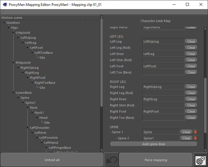 The mapping editor is a really simple concept - just drag and drop the skeleton limbs from the left-hand-side tree view into the appropriate ProxyMan limb field on the right. You don't need to fill them all, only the ones that are relevant. And voila - mapping convention sorted! It's a really handy system, and user friendly, and lets the user choose the correct character convention.