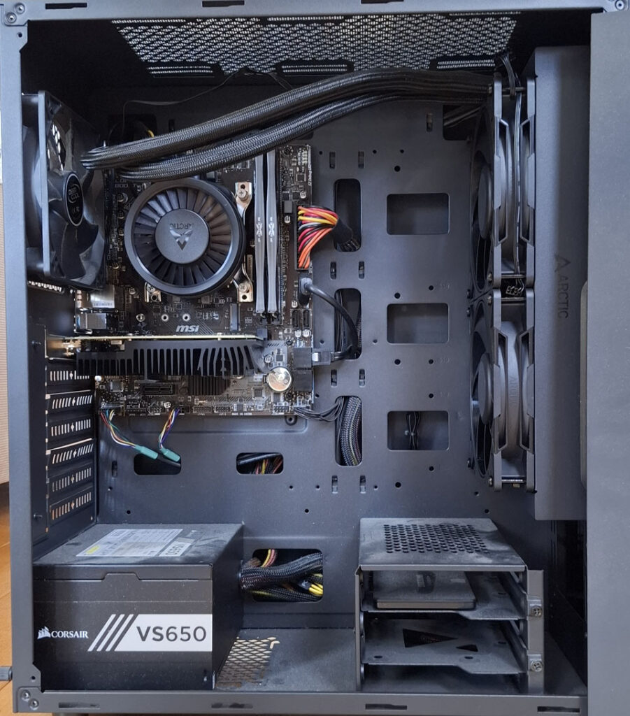 For anyone interested, the cooler is an Arctic Liquid Freezer Pro III, an AIO watercooler (that's what those hoses are for). It's the 280mm variant. Unfortunately, it doesn't quite fit above, so had to mount it on the front side. It's about as best as I could do. Parts of the motherboard get in the way at the top, there just isn't quite enough room to fit it there. But I doubt it will matter much to me.